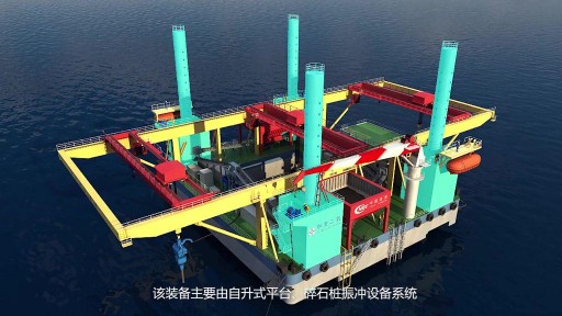 在“中长周期波涌浪海域自升式碎石桩施工平台”的动画里,我们做了一件现实世界中无法实现的事——让海水变得透明。