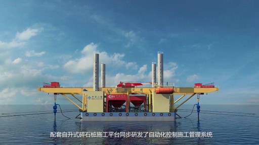 在“中长周期波涌浪海域自升式碎石桩施工平台”的动画里,我们做了一件现实世界中无法实现的事——让海水变得透明。